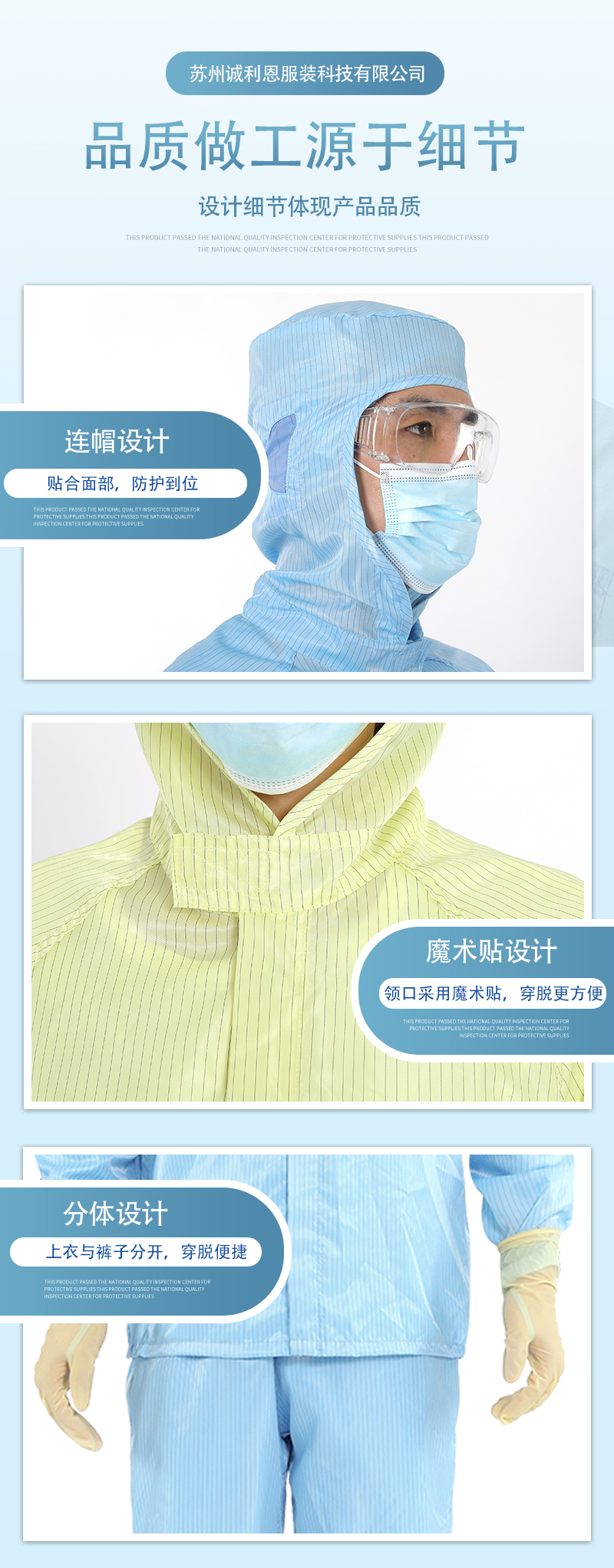 產品性能優勢:潔凈防塵、阻隔粉塵顆粒物、耐高壓濕熱滅菌、永久防靜電、立體剪裁、不起球、布面光潔