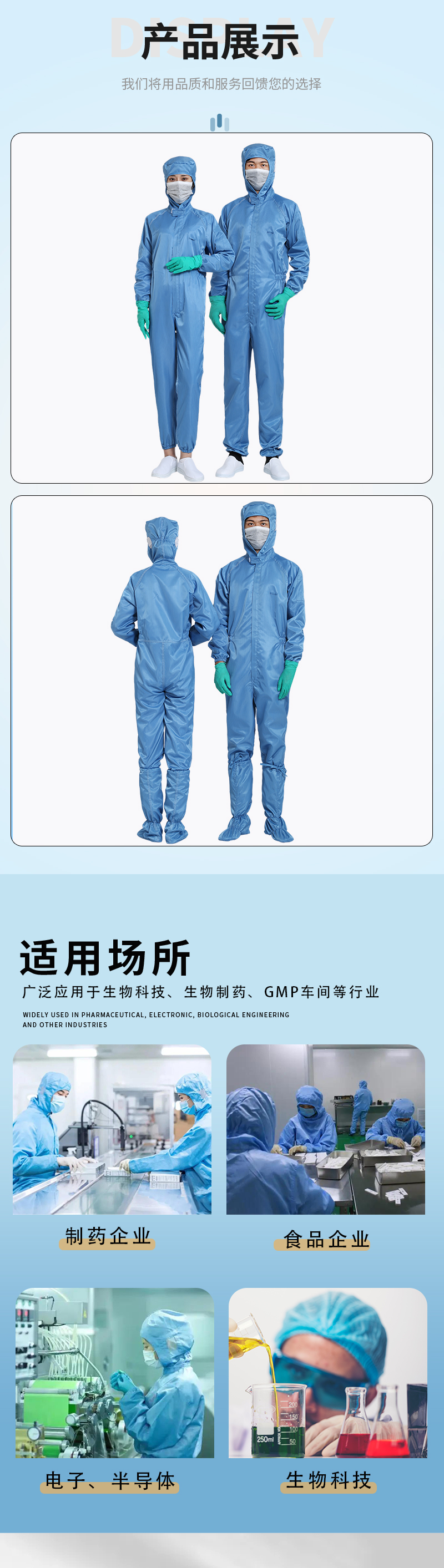 產品性能優勢:潔凈防塵、阻隔粉塵顆粒物、耐高壓濕熱滅菌、永久防靜電、立體剪裁、不起球、布面光潔