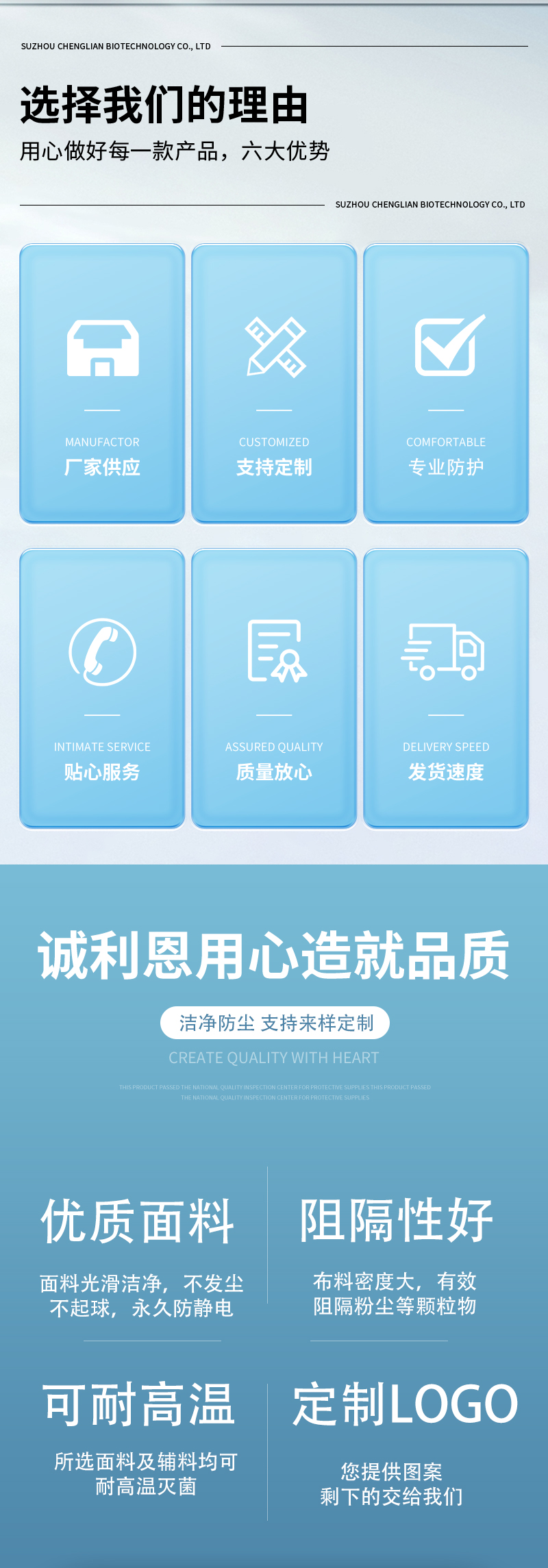 產(chǎn)品性能優(yōu)勢(shì):潔凈防塵、阻隔粉塵顆粒物、耐高壓濕熱滅菌、永久防靜電、立體剪裁、不起球、布面光潔